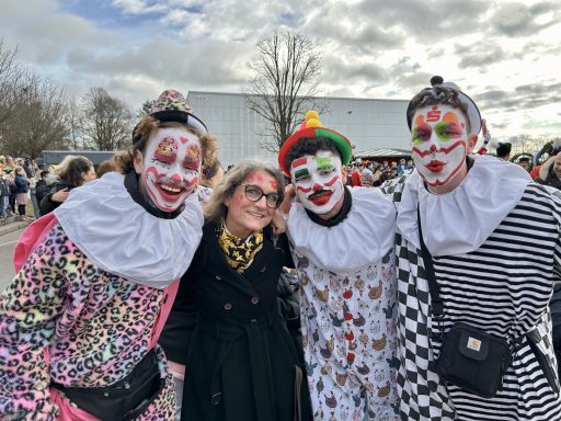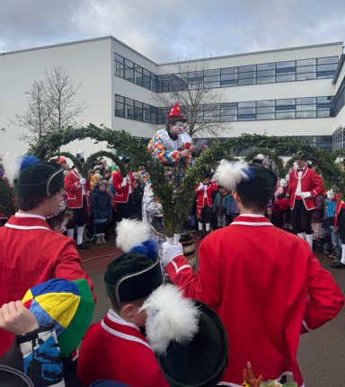 Nach sieben Jahren war es wieder so weit: Die Schäffler besuchten unsere Grund- und Mittelschule Dinkelscherben. Auf dem Pausenhof drängten sich unsere Schülerinnen und Schüler zusammen mit der Montessori- sowie der Helen-Keller-Schule rund um den Kreis der Tänzer, Musiker und fröhlichen Clowns. Mit ihren kunstvollen Sprüngen, ihren schwingenden Bögen und der fröhlichen Musik sorgten die Schäffler für Begeisterung und zauberten ein Lächeln auf viele Gesichter.