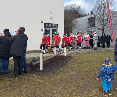 Nach sieben Jahren war es wieder so weit: Die Schäffler besuchten unsere Grund- und Mittelschule Dinkelscherben. Auf dem Pausenhof drängten sich unsere Schülerinnen und Schüler zusammen mit der Montessori- sowie der Helen-Keller-Schule rund um den Kreis der Tänzer, Musiker und fröhlichen Clowns. Mit ihren kunstvollen Sprüngen, ihren schwingenden Bögen und der fröhlichen Musik sorgten die Schäffler für Begeisterung und zauberten ein Lächeln auf viele Gesichter.